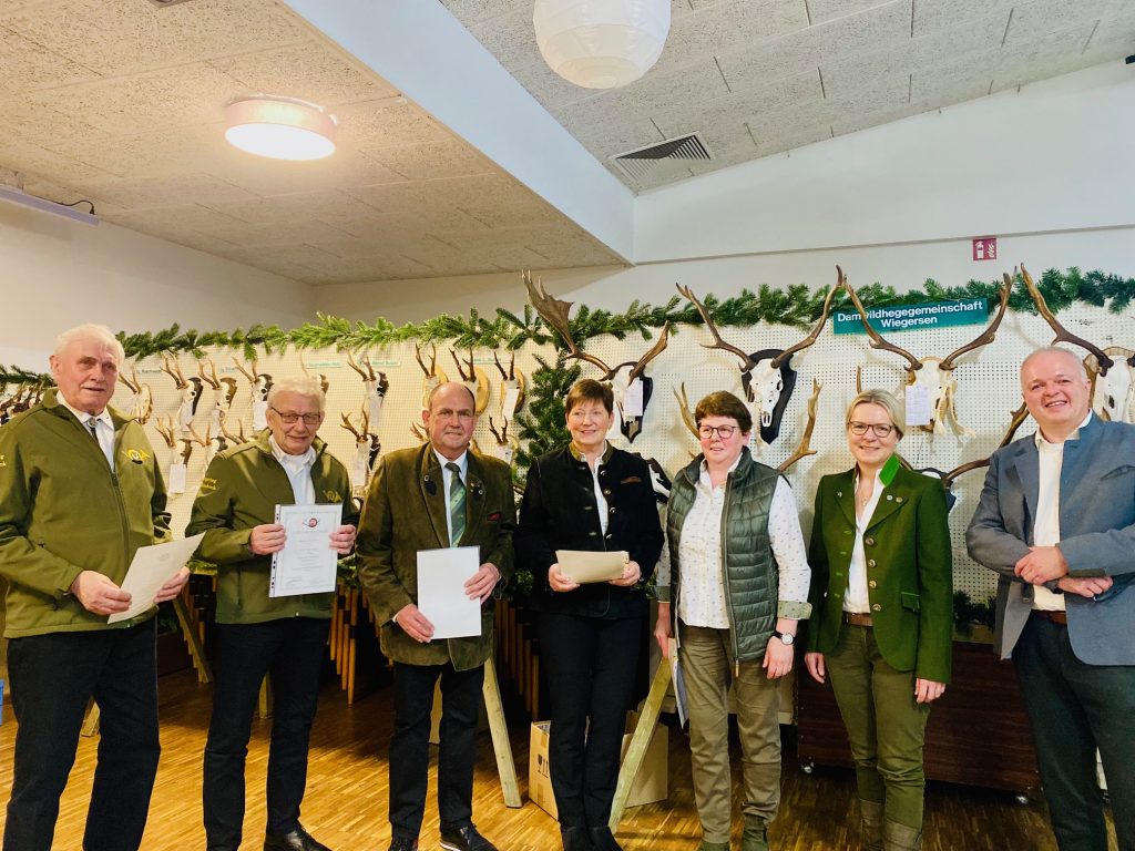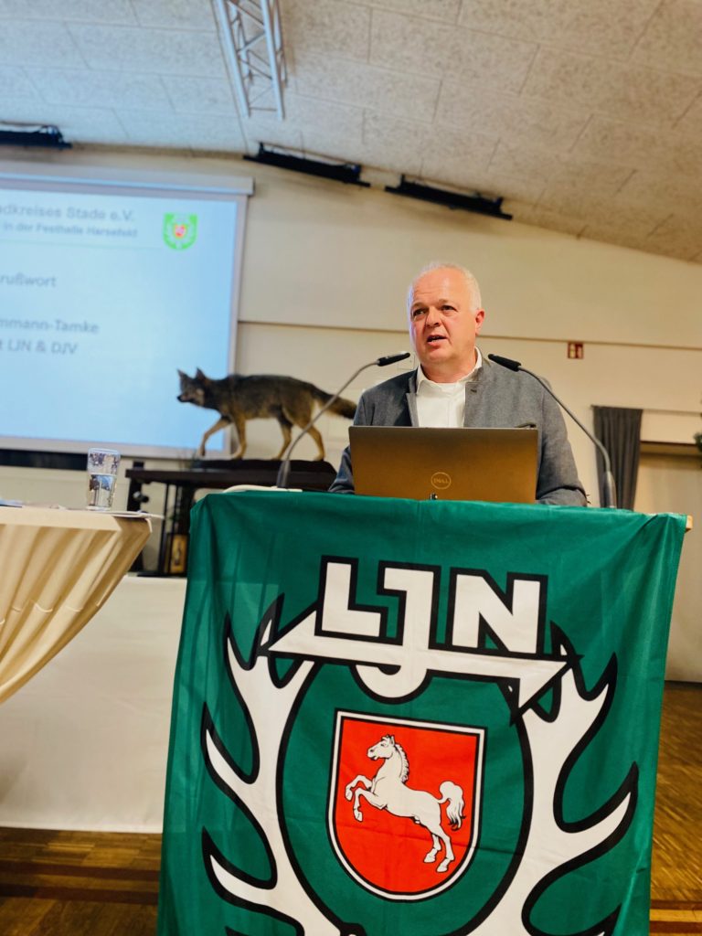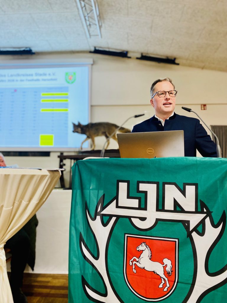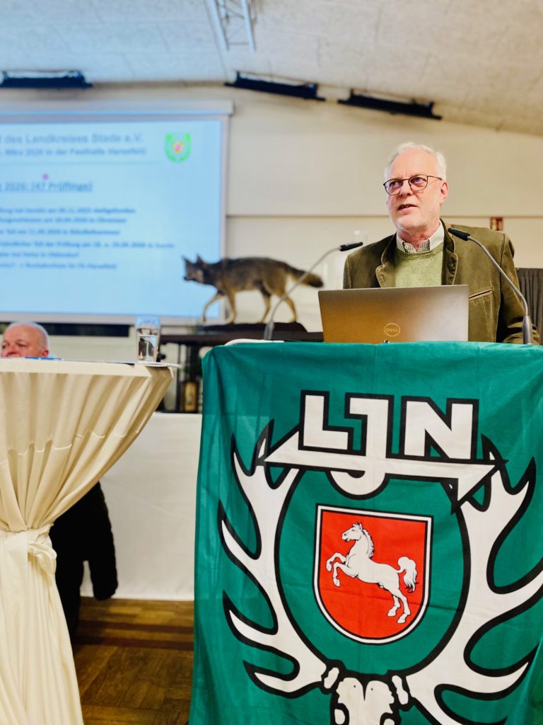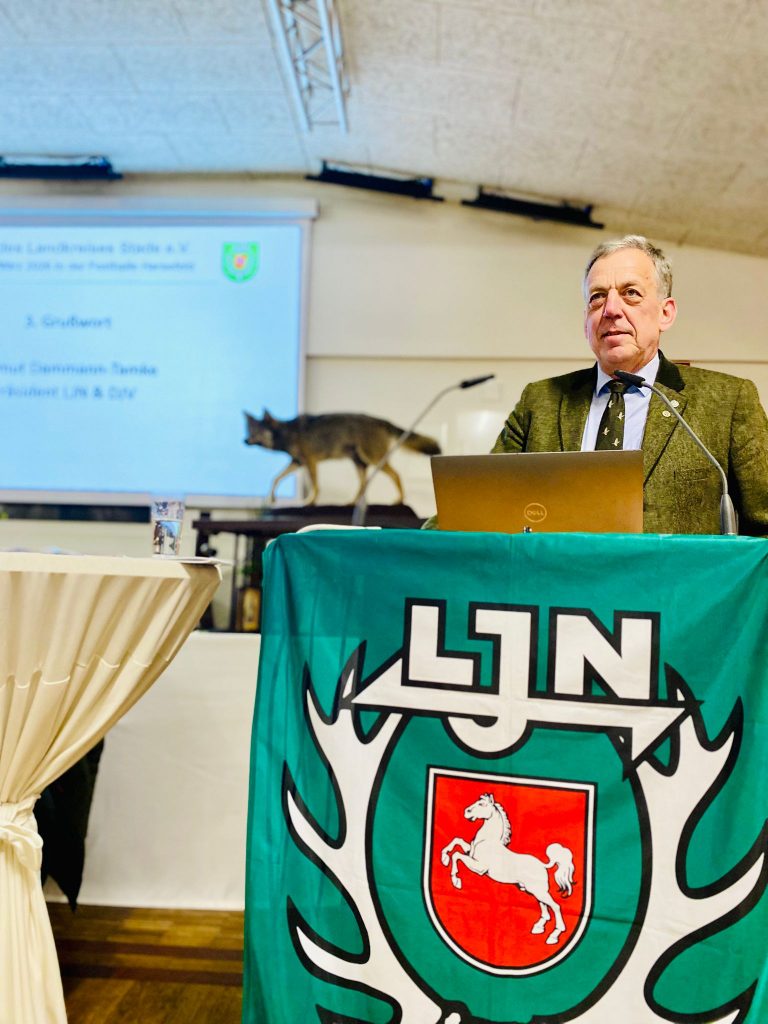 Der Präsident der Landesjägerschaft Niedersachsen und des Deutschen Jagdverbandes Helmut Dammann-Tamke dankte den Jägerinnen und Jägern für die Teilnahme an der Demonstration im Januar 2025 und berichtete über den Sachstand der Jagdgesetznovelle. Der Bundestag hat zwischenzeitlich beschlossen, dass der Wolf im Bundesjagdgesetz als jagdbares Wild eingestuft wird. Dem liege ein 14 Jahre langer Weg zugrunde, indem die Landesjägerschaft das Wolfsmonitoring 2011 übernommen hat. Seitens der Landesjägerschaft wird ein Zwei-Säulen-Model präferiert. Die eine Säule sieht bei einem Nutztierriss vor, dass der Nutztierhalter den Riss meldet, eine Rissbegutachtung und eine Kontrolle des Herdenschutzes stattfindet und theoretisch am selben Tag die Jagdbehörde das Erlegen des Wolfes in einem Schnellabschussverfahren anordnen kann. Die zweite Säule sieht eine Jagdzeit für die Entnahme von Jungwölfen mit 40% in der Jugendklasse vor, um die Sozialstruktur des Rudels intakt zu lassen. Der Eingriff in die Jugendklasse ist laut Dammann-Tamke wildbiologisch die richtige Lösung. Allerdings muss Niedersachsen noch einen Managementplan aufstellen.