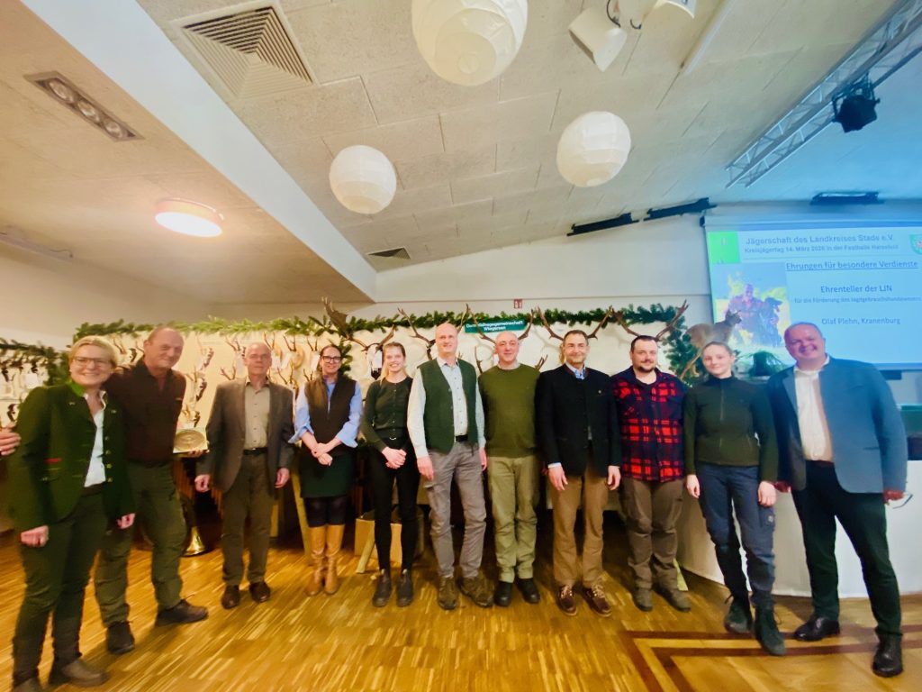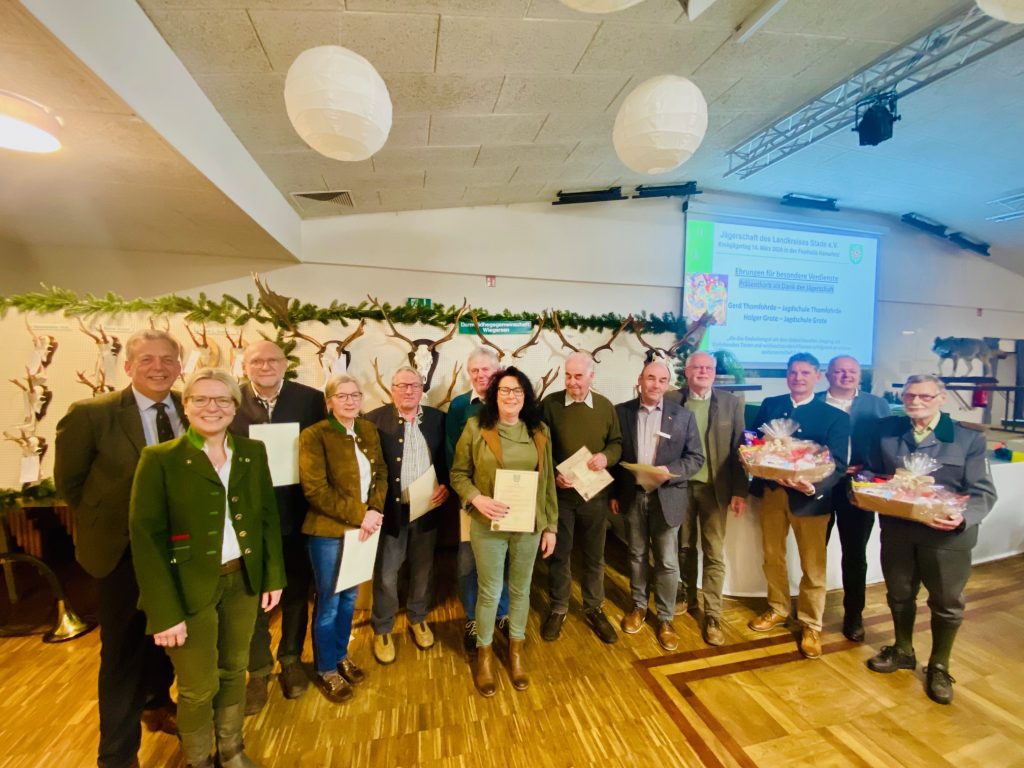 Auf dem diesjährigen Kreisjägertag der Jägerschaft im Landkreis Stade in der Festhalle Harsefeld konnte der Vorsitzende der Jägerschaft im Landkreis Stade e.V. Jens Hariefeld fast 300 Mitglieder und Gäste begrüßen und auf ein erfolgreiches Jagdjahr zurückblicken. Der Vorsitzende Jens Hariefeld geht im Weiteren auf die Entwicklung der Rebhuhnschutzprojekte, des Wiesenschutzprojektes sowie den beabsichtigten Ausbau der Projekte ein. Hervorzuheben sind beim Rebhuhn (als Vogel des Jahres 2026) der erfasste Projekterfolg mit einer Verdoppelung des Besatzes in einer Projektlaufzeit von nur 4 Jahren geführt hatte. In der Planung ist derzeit eine gemeinsame Absichtserklärung zwischen dem Naturschutzamt des Landkreises Stade, den Samtgemeinden Fredenbeck, Harsefeld, Apensen, Oldendorf und der Jägerschaft des Landkreises Stade e.V. über die Zusammenarbeit auf dem Gebiet des Umwelt- und Artenschutzes. In dieser Absichtserklärung soll es um Kompensationsmaßnahmen, die Anlage und Pflege von Wegerandstreifen, Blühstreifen und naturschutzrechtlichen Ausgleichsmaßnahmen sowie Heckenpflege gehen.